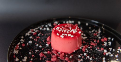 Savoiardo al matcha con crema di frutti rossi, soffice mousse allo yuzu e glassa al lampone.